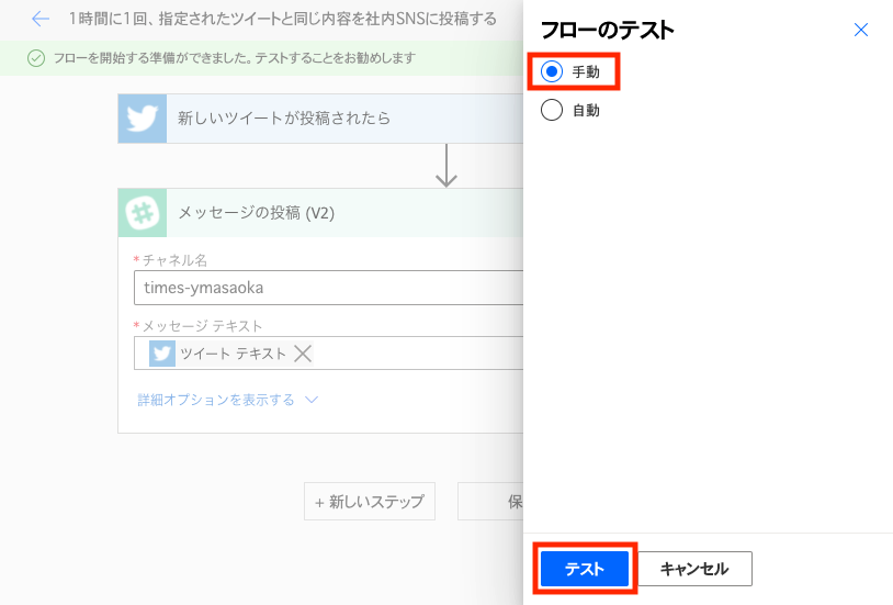 ここで、画面内にあるテストボタンを選択し、手動モードでテストを開始します。その後、新規にツイートを行えばトリガーが起動し、Slack へ専用のアプリがツイートと同じ内容の投稿を行うことを確認できます。
