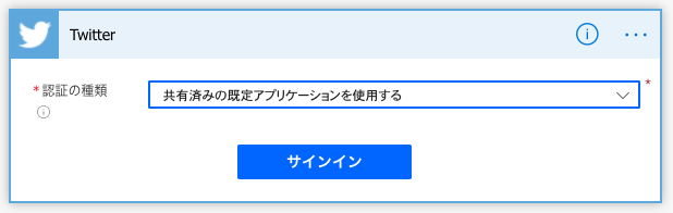 認証の種類は、既定で選択されている共有済みの既定アプリケーションを使用するを選択で問題ありません。こちらを選択することで、Microsoft が管理する Twitter クライアントアプリケーションを使用して認証を行うことになります。