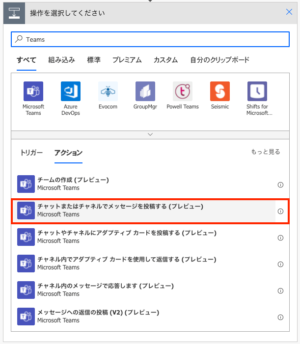 新しく作成した分岐の方の検索窓で Teams を入力し、アクションの一覧の中からチャットまたはチャネルでメッセージを投稿するを選択します。