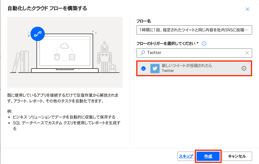 トリガーを選択したら、作成ボタンを選択して、フローを作成します。