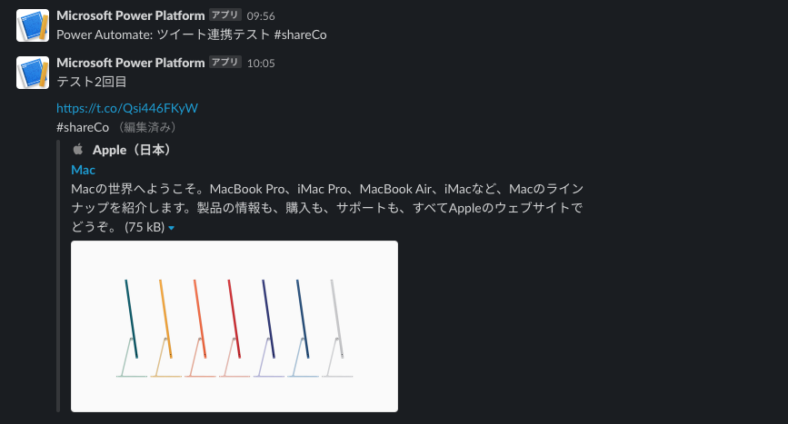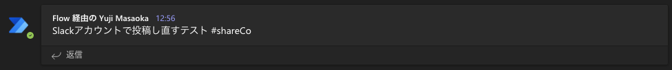 実際に Slack に投稿された内容を見ると、Microsoft Power Automate という名前のアプリがツイート内容を投稿しており、ぱっと見、イケてない感がある感じでしょうか。ここは、アプリの名前を変えるか、自分のアカウントで投稿したように見せたいので、Slack コネクタの設定を追加していきます。