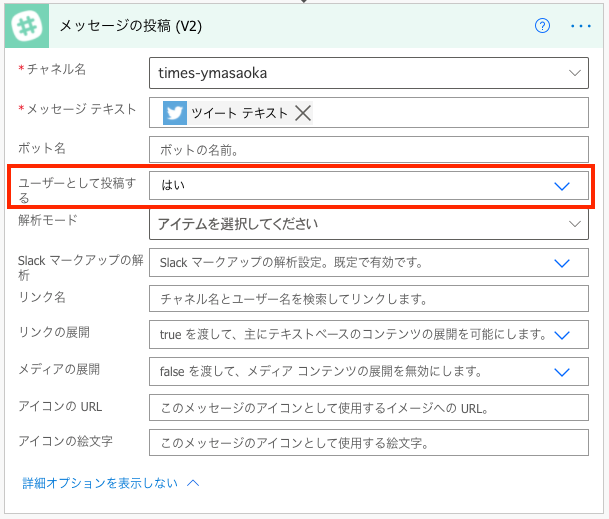 Slack コネクタの詳細オプションを表示するボタンを選択し、ユーザーとして投稿するの設定値をはいに変更して再度フローを保存します。