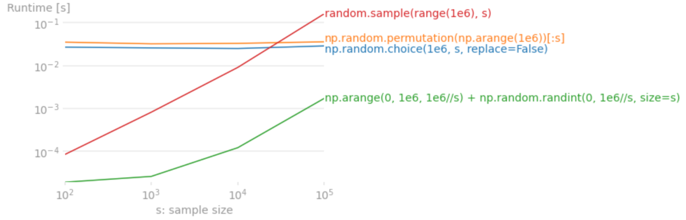 labels=["np.random.choice(1e6, s, replace=False)", "np.random.permutation(np.arange(1e6))[:s]","np.arange(0, 1e6, 1e6//s) + np.random.randint(0, 1e6//s, size=s)", "random.sample(range(1e6), s)"],