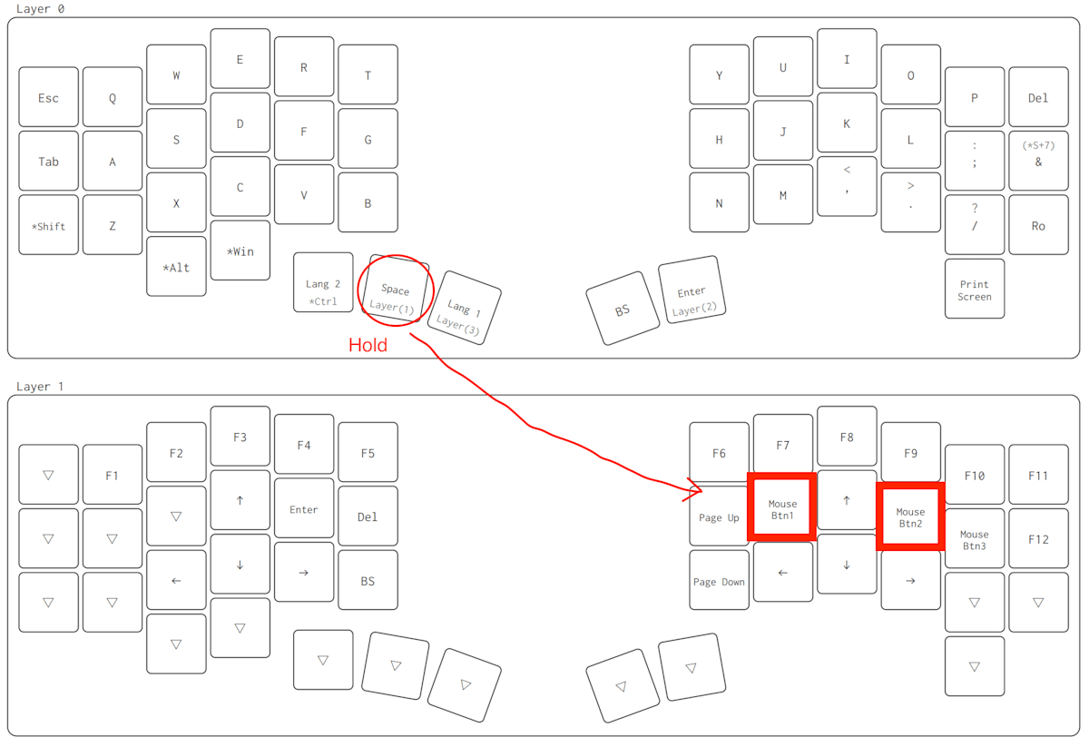 の位置にボタン2が配置されています。親指ボタンの長押し(Hold)でレイヤ1を有効化しつつ J