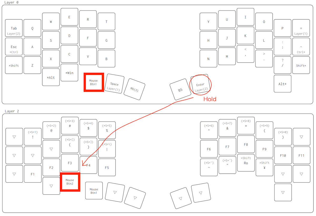 デフォルトレイヤのキーにボタンを割り当てれば、ボタン操作のためにレイヤ切り替えをする必要はなくなります。とはいえキー数が限られているので、まずはMod-Tapで既存の修飾キーに重ねてボタン1を割り当てることにしてみました。つまり、Tapならボタン1、Holdなら元々割り当てていた修飾キーの動作になる形です。マウスレイヤでは同じ位置にボタン1を単独で割り当てました。