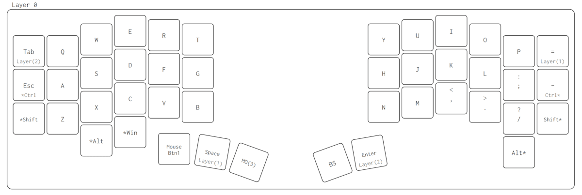 - レイヤ0: アルファベットと各種Modifier、マウスボタン1、レイヤ1〜3の有効化
