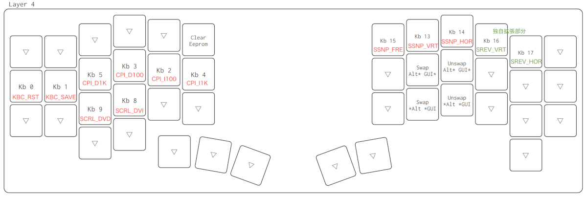 - CPIとスクロール除数は keyball.h のデフォルト値定義を好みの値に変えており、CPI_* (Kb 2〜5) SCRL_DV* (Kb 8〜9) は割り当てているが普段は使わない