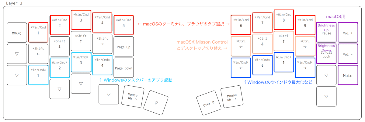 - レイヤ3: マウスホイール左右、OS固有のショートカットキー、レイヤ4の有効化