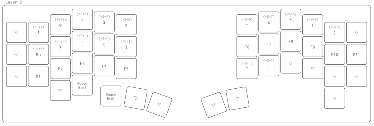 - レイヤ2: レイヤ1の数字と記号にShiftを付加したもの、ファンクションキー、マウスボタン2