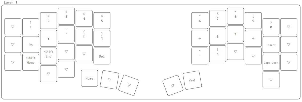 - 親指のところにHomeとEndを割り当てているのに加え、Shiftを付加したHomeとEndを左手側に配置している