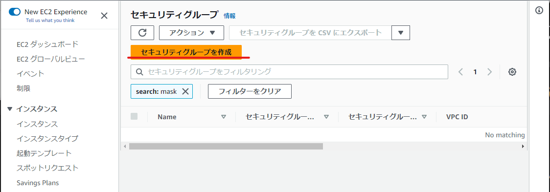 右上にある「セキュリティグループを作成」ボタンを押します。