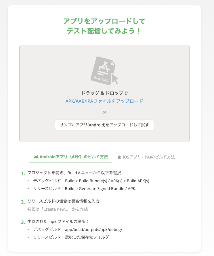 deploygateもapkファイルをアップロードするだけで、テスト用ビルドを配布することができます。