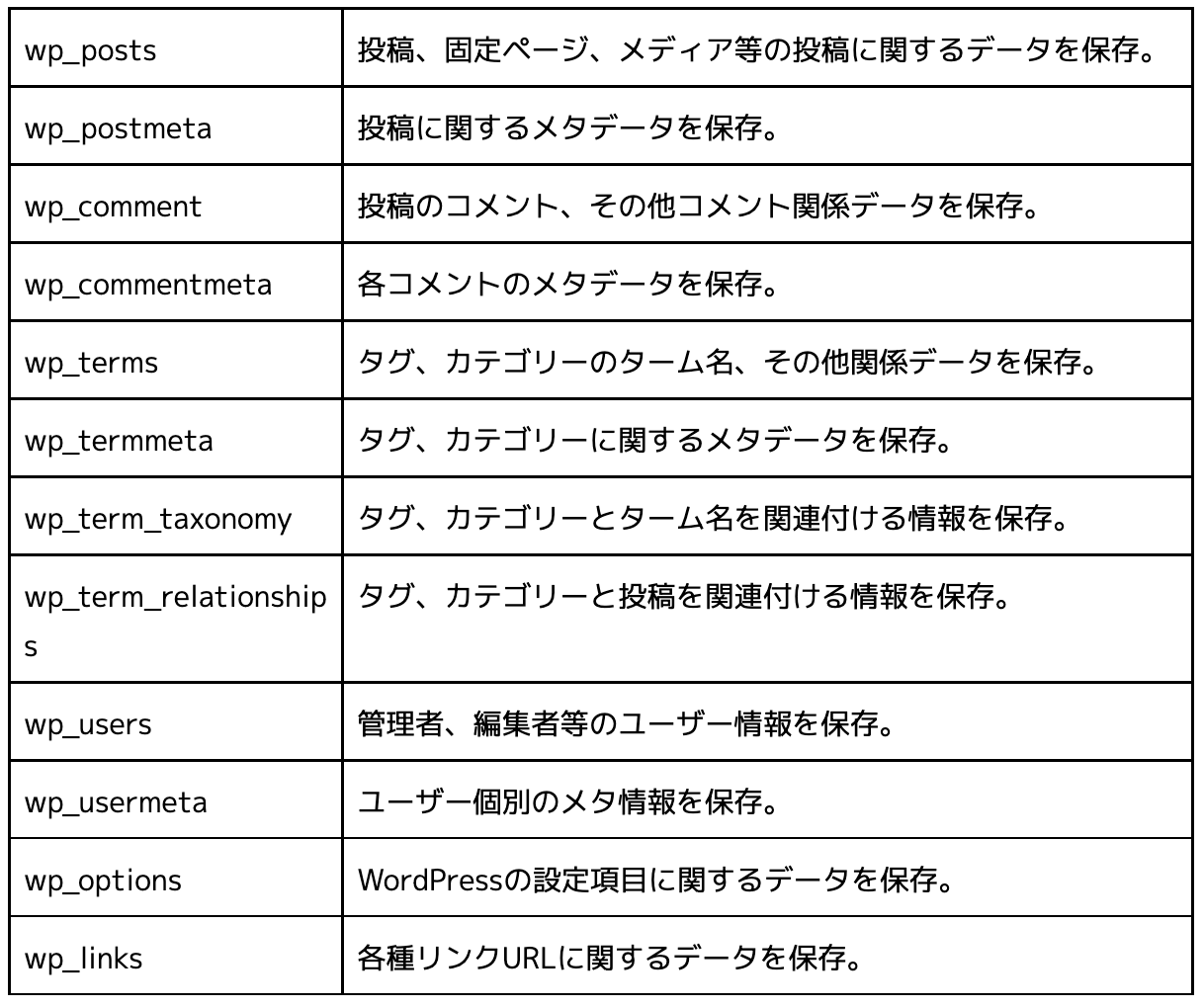 Wordpressをインストールすると初期状態でのDBテーブルは以下のようになっている。