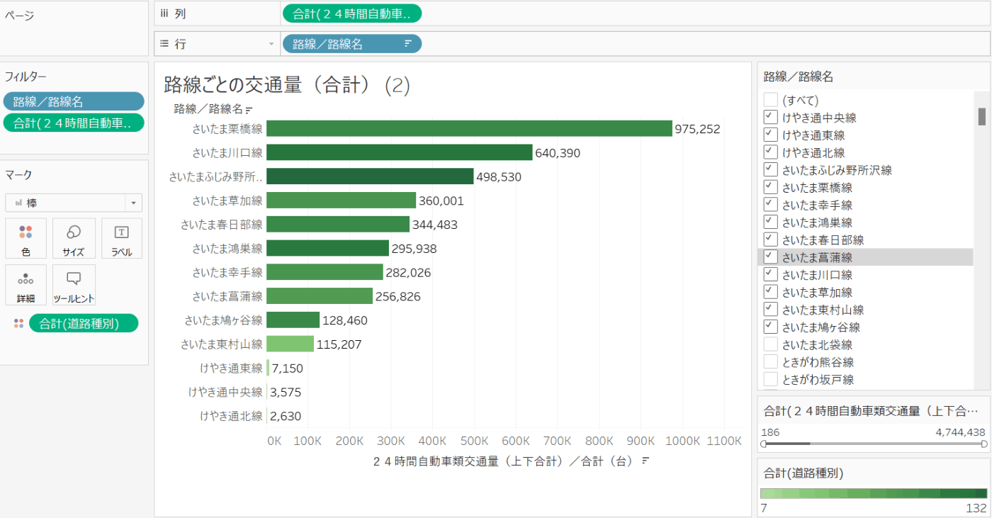 データペインのメジャーにある「24時間自動車類交通量(上下合計)/合計(台)」を列シェルフにドラッグ&ドロップします。