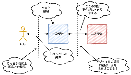 現在の日本のよくあるソフトウェア開発だと、一次受けベンダーが要件整理などをしてドキュメント化します。そうなると、アジャイルにおける顧客と開発の間の境界線は、お客さんと一次受けベンダーと、二次受けの間にある、というのが実情ではないでしょうか?