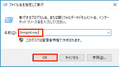 1.Window+R(MacはConmmand+R)でファイル名を指定して実行を開き「fsmgmt.msc」と入力し、OKを押下します。