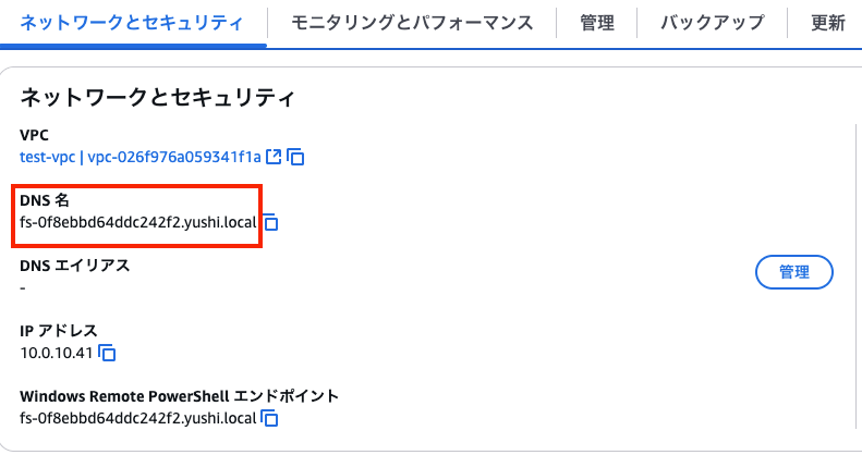 Fsxの「ネットワークとセキュリティ」タブを開いて、DNS名を控えておきます。