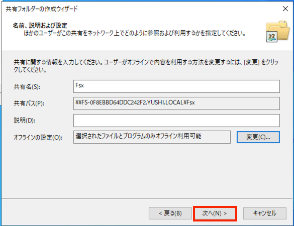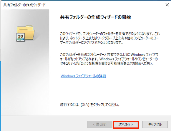 共有フォルダ作成ウィザーの指示の沿って共有フォルダを作成します。