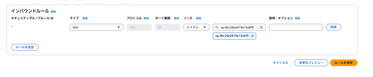 タイプ=SSH、ソース=カスタムでソースには踏み台サーバーのセキュリティグループを設定します。