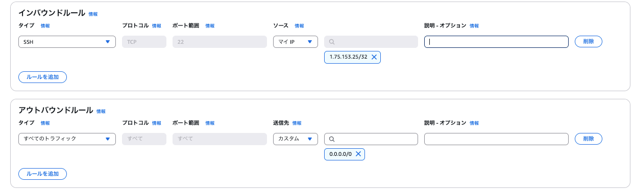 インバウンドルールにタイプ=SSH、ソース=マイIPとして設定します。