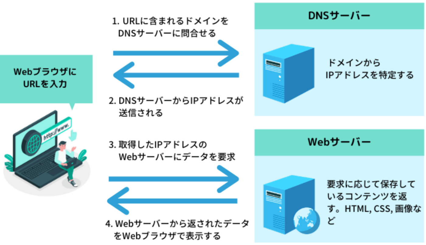 1.URLに含まれるドメインからDNSサーバーにWebサーバーのIPアドレスを問合せ