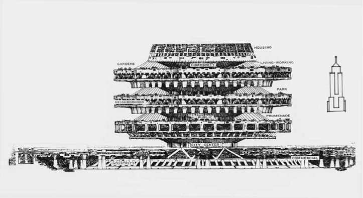 Paolo Soleri's "hyperstructure" in ground-level view. The figure to the right is the Empire State Building at the same scale.