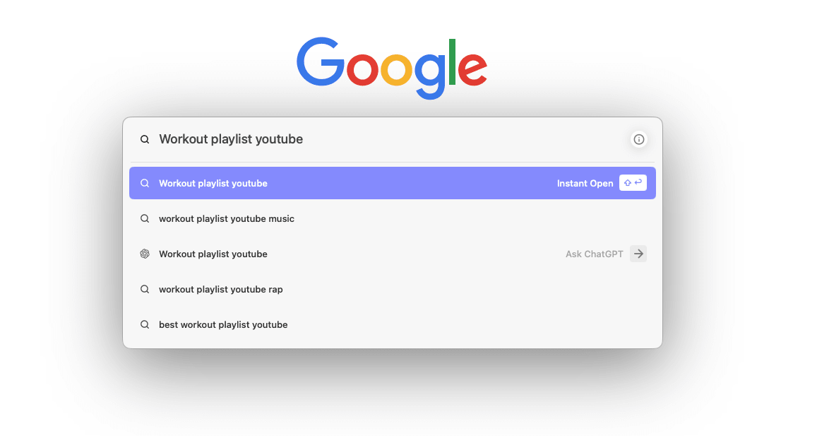 例えば、「Workout playlist youtube」と検索したときに、検索結果を介さずに、Youtube の動画ページを開いてくれます。
