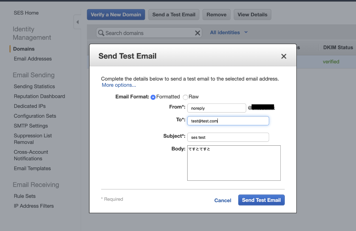 Domains -> Send a Test Emailから、検証済のメールアドレスに対してメールのテスト送信を実行することができます。
