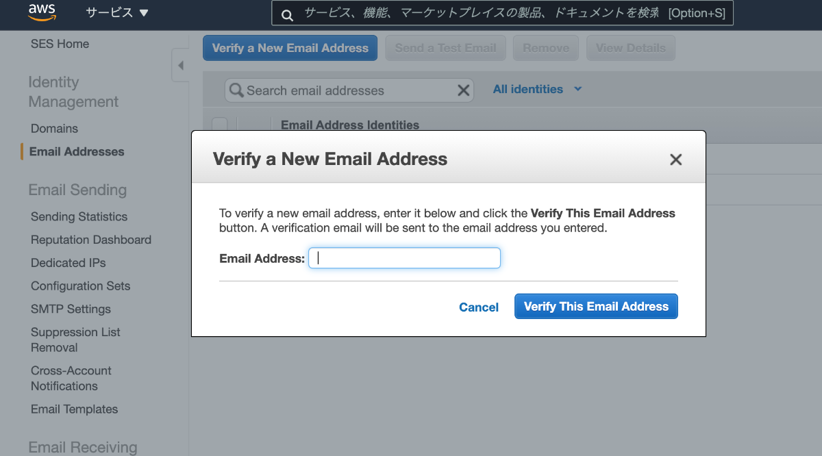 検証済メールアドレスの追加は、Email Addresses -> Verify a New Email Addressから新規に追加することができます。