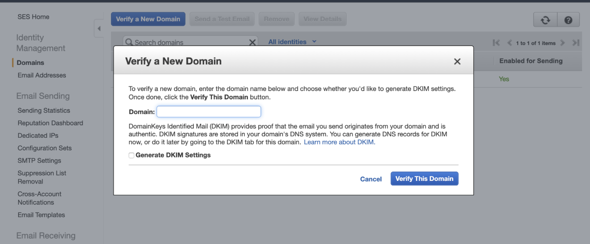 Domains -> Verify a New Domainをクリックし、先程取得したドメインを入力。