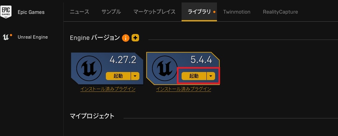 まずはエピックゲームランチャーを起動し、エディタの立ち上げを行います。画像はUnrealEngine5.4のバージョンを使用しています。「起動」のボタンを押しましょう。今回はUnrealEngineのバージョン5.4を使用しています。