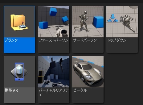 テンプレートを使用したくない場合は、「ブランク」(空のプロジェクト)を選びます。UnrealEngineに慣れてきたらこれを選ぶのも良いですが、当サイトでは積極的にテンプレートを使っていきます。ブランクを除くテンプレートは以下の通りです。