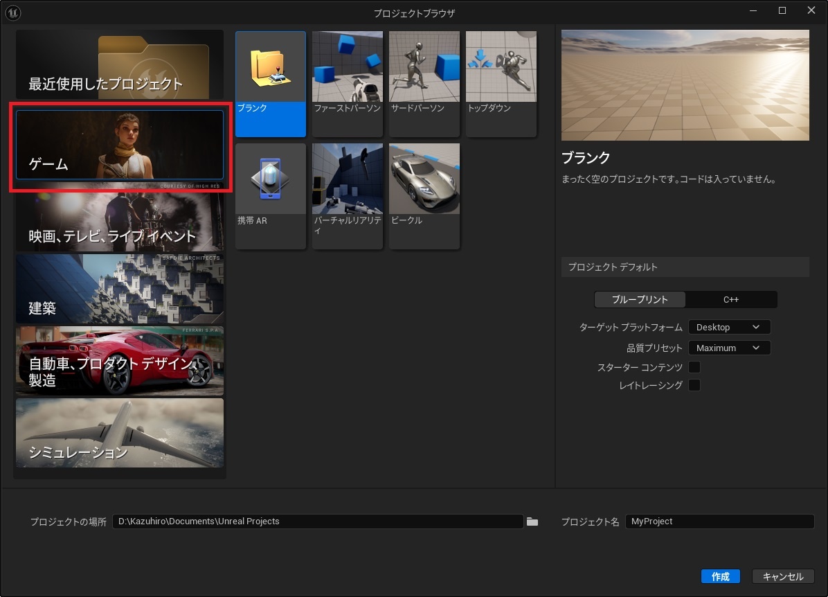 - ブループリント/C++ ゲーム制作にブループリントを使うか?C++を使うか?を選びます。本サイトでは必ず「ブループリント」を選んでください。