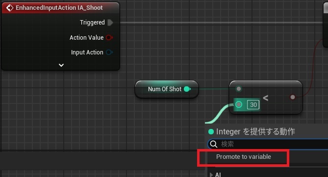 残弾数を表示するためにBP_Weapon_Componentのブループリントを改良します。BP_Weapon_Componentは銃の発射に関するクラスであり、以前30発撃つと撃てなくなる仕組みを追加しました。撃った数はカウントしていますが、銃の発射上限値である装弾数は30と直接数値入力しています。これは「マジックナンバー」と言われ、柔軟性に欠けるプログラミングではあまり望ましくない状態ですので変数化しましょう。コンテンツ/FirstPerson/Blueprints/BP_Weapon_Componentを開きます。以前作ったイベントでIA_Shootの入力イベントを探します。左の”EventGraph”項目のイベント一覧からダブルクリックすると素早く見つけられます。入力イベントに現在のショットが30未満かどうか調べる部分があります。30と直接入力しているスロットのピンからワイヤを伸ばしPromote to variable(変数に昇格) を選びます。変数が作られますので選択して、F2キーを押して名前変更モードにして名前をGunCapacityにします。コンパイルしてデフォルト値が30になっているのを確認します。