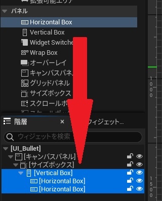 VerticalBoxとHorizontalBoxを階層パネルで追加する