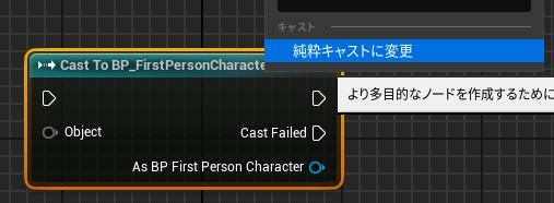 最初から用意されているノードの下の方で右クリックしてCast To BP_FirstPersonCharacterノードを作ります。これを右クリックして純粋キャストに変更を選びます。純粋キャストに変更すると実行ピンが無くなってノードの実行順に関係なく値を出力するノードになります。