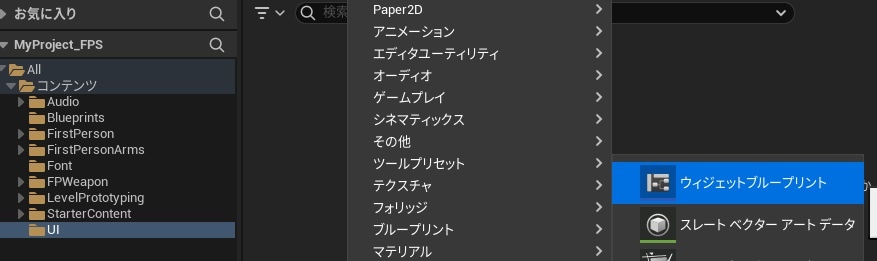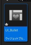 まずはUIの入れ物となるウィジェットを作っていきましょう。先ほどと同じくコンテンツ直下にUIフォルダを作り、その中で右クリックします。ユーザーインターフェース/ウィジェットブループリントを選びます。名前は「UI_Bullet」にします。