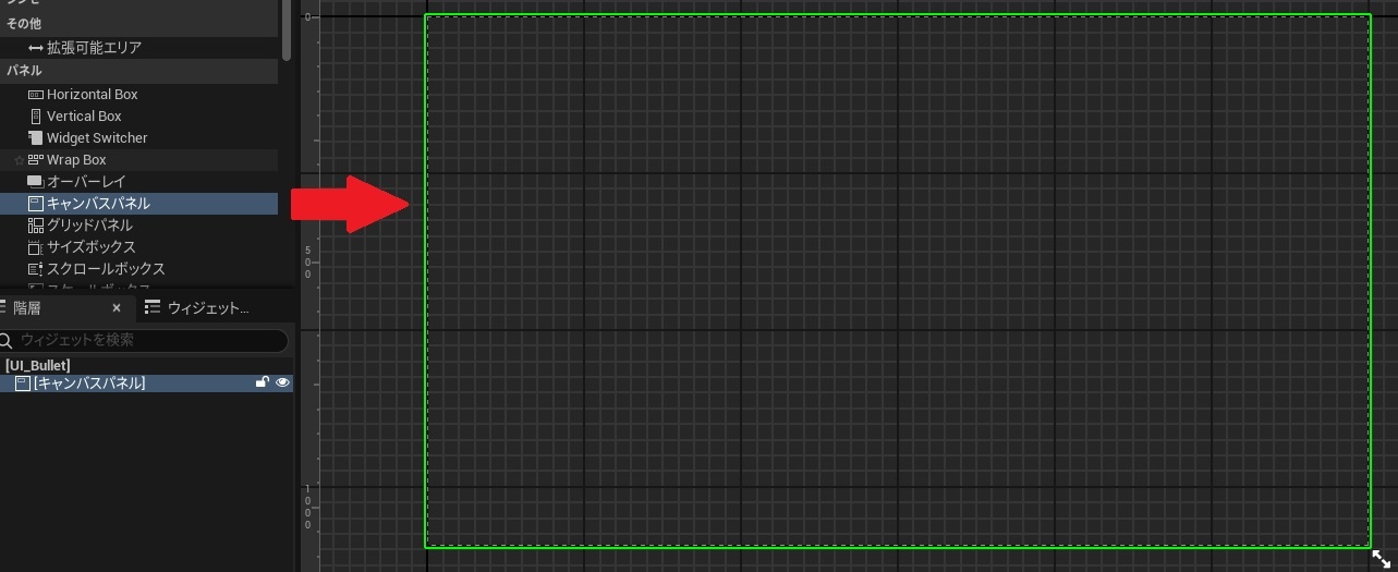 作ったウィジェットブループリントをダブルクリックして開きます。左側のパレットからパネル/キャンバスパネルをドラッグアンドドロップして置きます。黄緑の枠が出来るはずなので今後この中に各種UIを配置していきます。