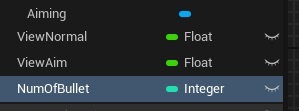 この計算結果をBP_FirstpersonCharacterに伝える必要がありますので受け取る変数をFirstpersonCharacter側に作っておきます。コンテンツ/FirstPerson/Blueprints/BP_FirstPersonCharacterにを開きます。左側のパネルでプラスボタンを押して変数を作り、名前を「NumOfBullet」にしてInteger型にします。