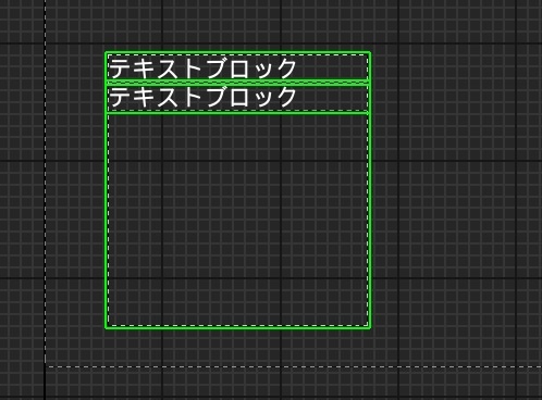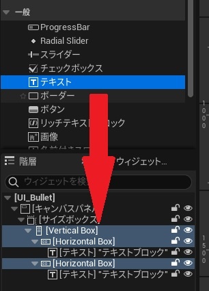 現在HorizontalBoxが二つあると思いますがそこに一般/テキストをドラッグアンドドロップしてそれぞれに重ねるように配置します。