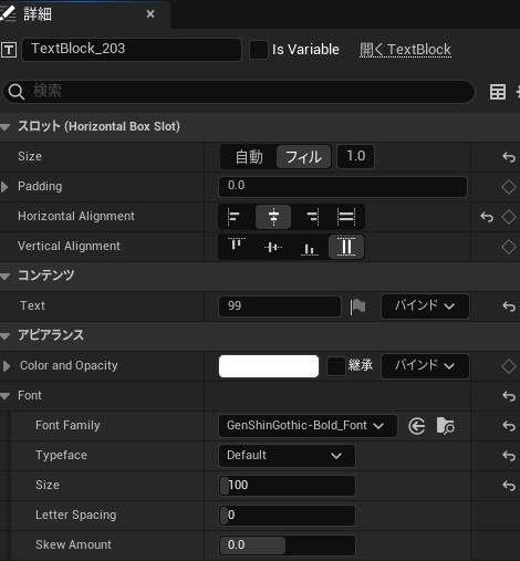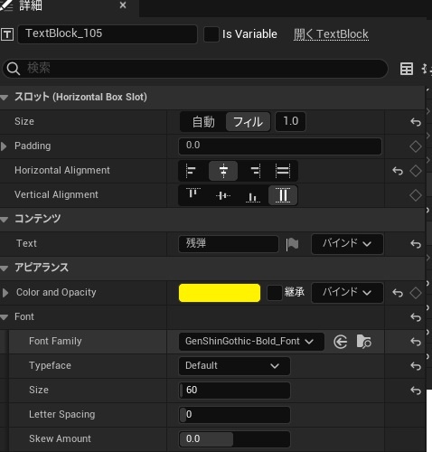 文字は表示されましたが残弾が”99”のままです。99にしたのは最大表示桁数(今回は2ケタ)を確認するためです。これを内部の変数とバインド(リンク)させます。ウィジェットブループリントを開き、弾数の99の部分をクリックした状態で詳細パネルのText部分の右側、バインドのプルダウンを開き、バインディングを作成を選びます。エディタがグラフ作成(ブループリント作成)モードになります。元のデザイナーモードとは右上のボタンで切り替えることができます。デザイナーの方を押すと最初のエディタの状態になります。