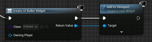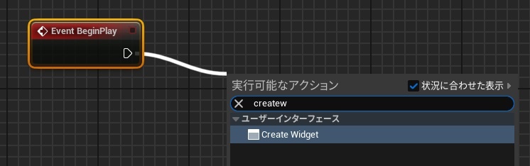 何もないところで右クリックして「Beginplay」と入力しEvent Beginplayノードを作ります。「Creatw…」と入力してCreate Widgetノードを作ります。作ったノードのクラスを先ほど作ったUI_Bulletにします。ゲーム画面の上にウィジェットを作りますがこれだけでは表示されません。