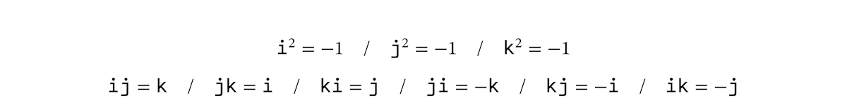 クォータニオンの定義がかけ算の交換法則を満たさないものになっている理由は、クォータニオンを使う動機と関係があります。後述するように、クォータニオンは 3 次元の回転を表現するための数として考案されました。このような定義にしておかないと、3 次元の回転をうまくあらわせないのです。