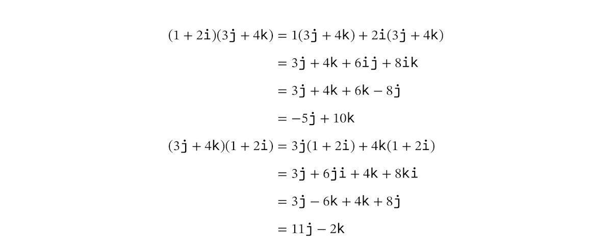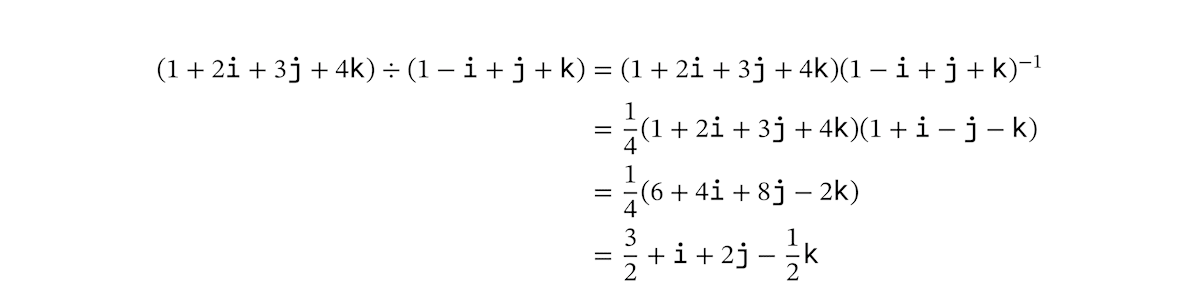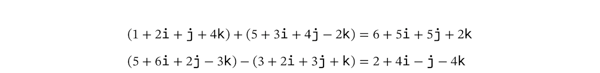 クォータニオンの計算は、多項式の計算と同じようにおこないます。たとえば、足し算と引き算は次のようになります。