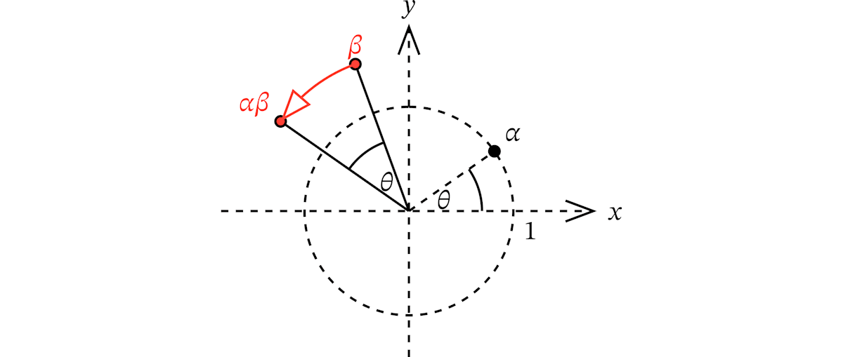 の回転を、絶対値θ で偏角1 の複素数θ であらわす。\cosθ + \mathtt{i}\sinθ