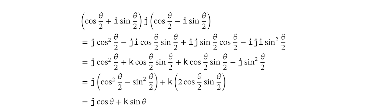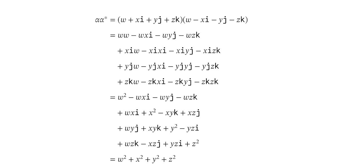 普通の数の計算に慣れていて「かけ算の順序は好きに入れ替えてよい」という感覚が身についてしまっている人だと、無意識に順序を入れ替えてしまうことがあります。クォータニオンのかけ算は、虚数単位の周辺では順序をきちんと意識する必要があります。