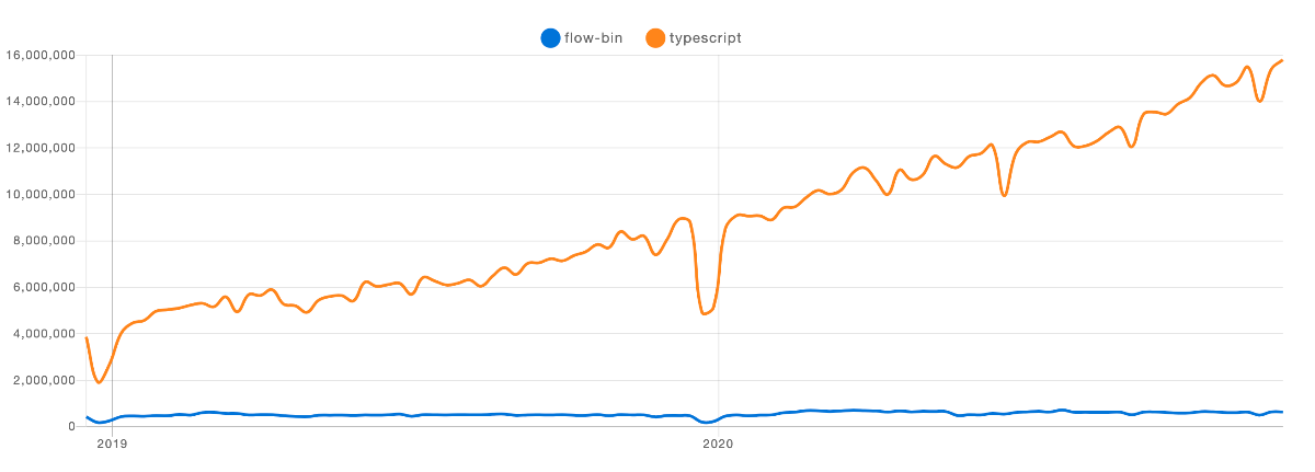 NPM trends を見ても TypeScript のコミュニティの勢いは圧倒的です。