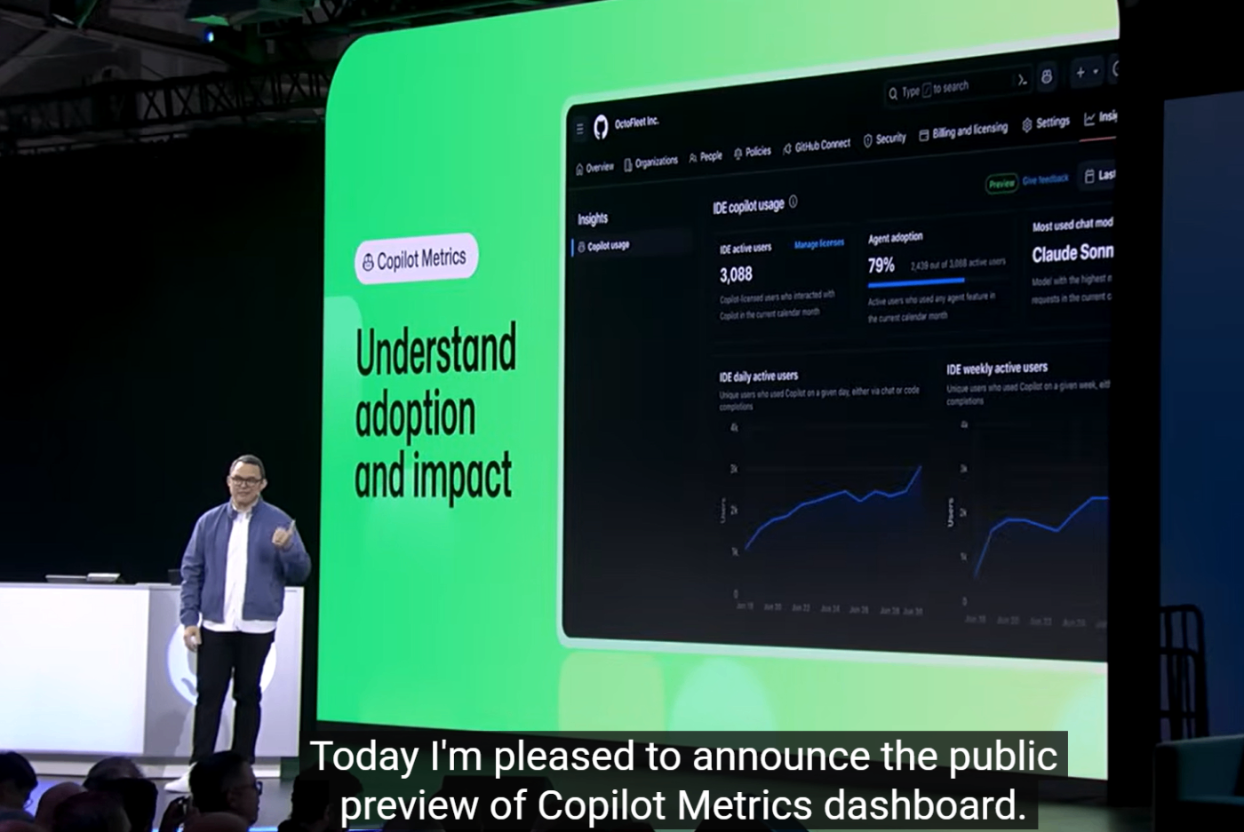 GitHub Copilotの利用状況(アクティブユーザー、エージェントの提案の受け入れ率)をグラフィカルなダッシュボードで確認することができる。