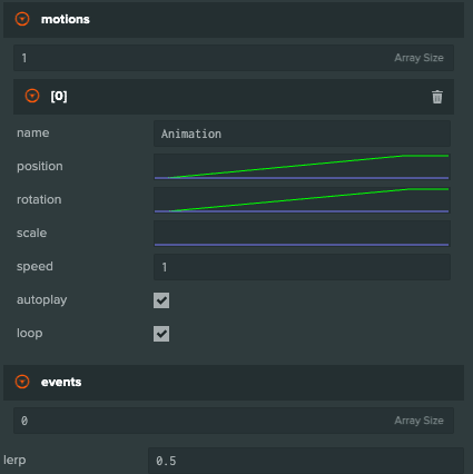 設定できる項目は、name, position, rotation, scale, speed, autoplay, loopの項目が設定できます。