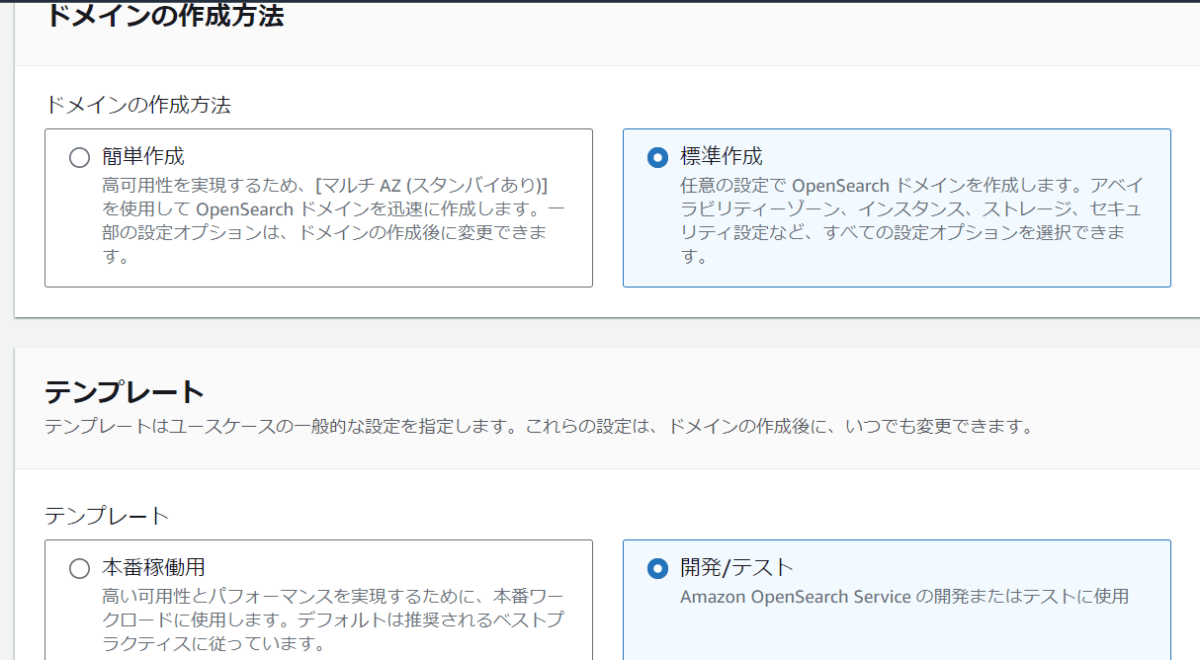 OpenSearchのコンソール画面からドメインの作成を選択後、任意のドメイン名を決めます。ドメインの作成方法と開発テンプレートはそれぞれ「標準作成」、「開発/テスト」を選択します。